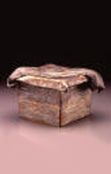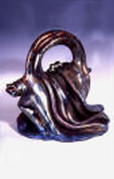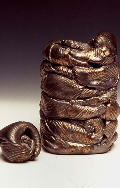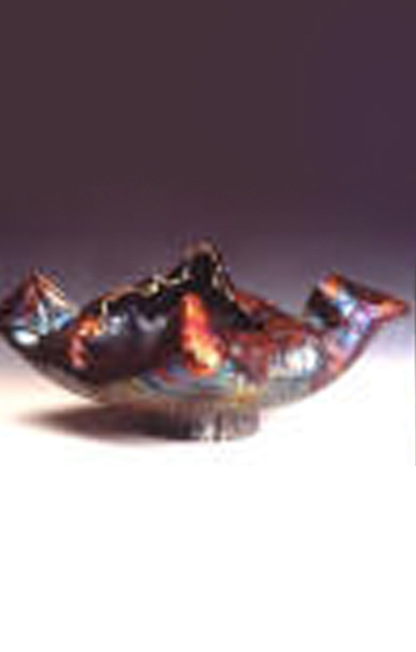 Covered jars, boxes, and teapots are raku fired, producing metallic rainbow colors. Whether made from cut slabs (box), twisted slab segments (jar), or a draped slab (teapot), these decorative artworks radiate reflected and color.